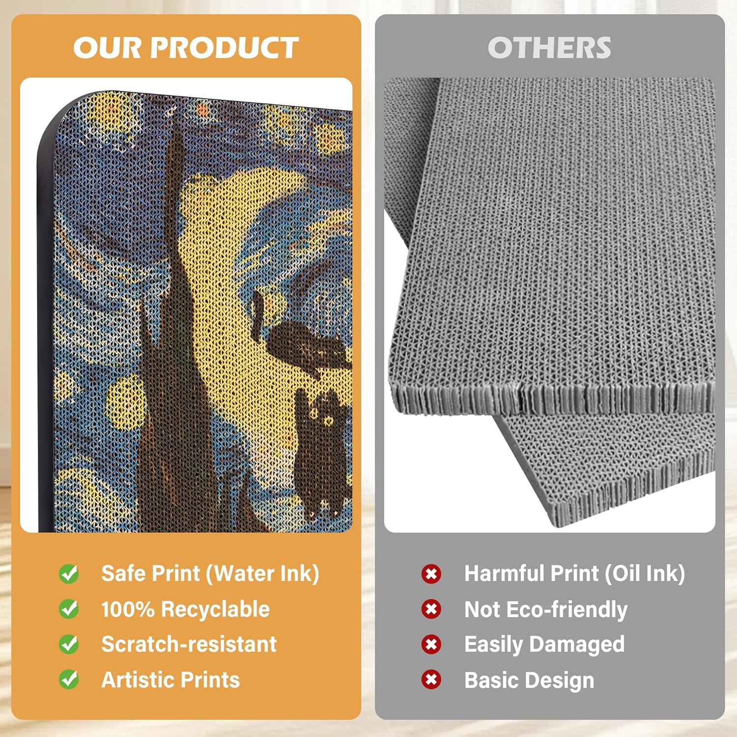 - Safe water-based ink: Our cat scratching pad is made from durable, high-density corrugated cardboard, free from harmful substances. Printed with water-based ink, safe even if your cat lick or bite. Fully recyclable, reducing environmental impact-great for indoor cats